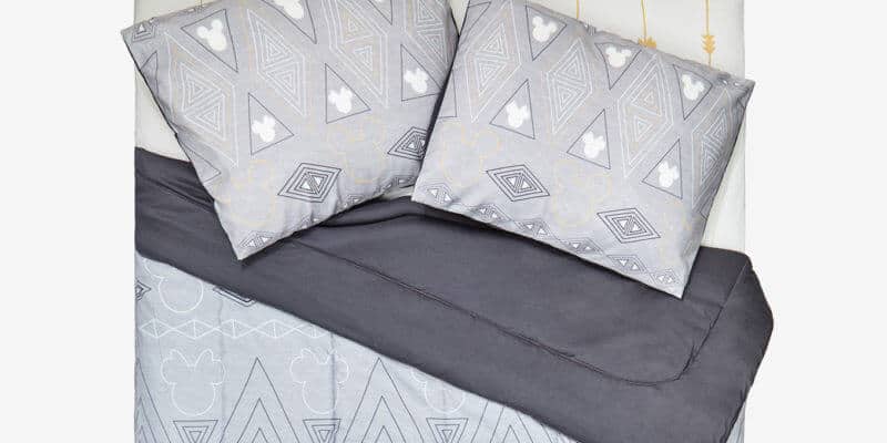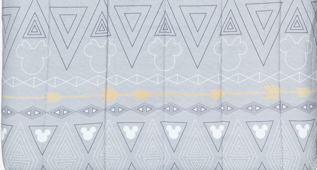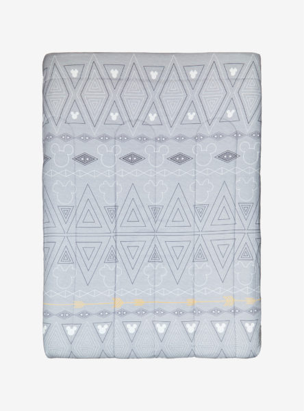 This 100% polyester comforter features a modern geometric Mickey and Minnie Mouse pattern.