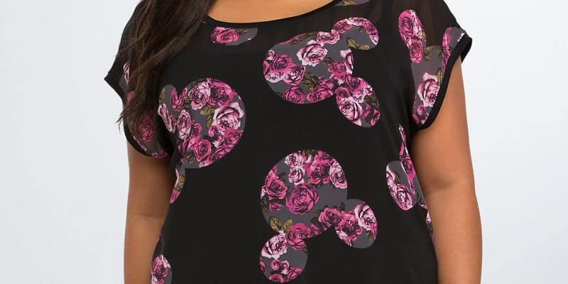 Oh Mickey you’re so fine, this top blows our mind! Solid black tee-like material covers the back, while the sheer chiffon front is all about the wonderful world of Disney. Mickey’s iconic mouse head gets a feminine upgrade with a pretty pink floral print.