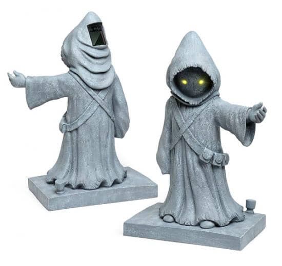 This Think Geek exclusive is an officially licensed Star Wars lawn ornament.  Each Jawa stand just about half a meter tall.  His glowing yellow eyes are powered by a solar panel (found on the back of his hood) charged battery.