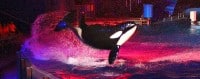 Summer Nights splashes SeaWorld Orlando with vibrant color as Antarctica glows while fireworks burst over Shamu Rocks